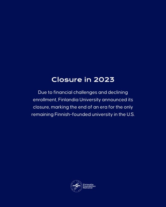 On March 2, 2023, Finlandia University announced that it would not enroll students for the 2023–2024 academic year, citing financial challenges and declining enrollment. This marked the closure of the last remaining institution of higher learning in North America founded by Finns—a significant moment in both Finnish-American and American educational history.