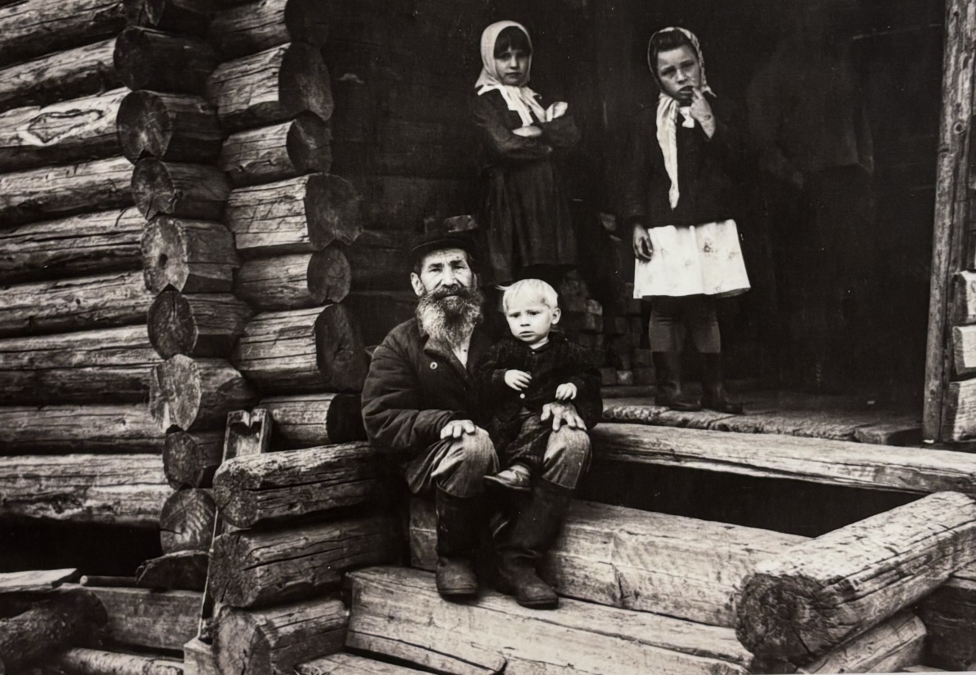 Komi Permyak Ilya Sizov with his grandchildren. Sizovo, Kochyovsky District, Komi-Permyak National Okrug, Perm Oblast. Photo: Kalju Konsin, 1967.