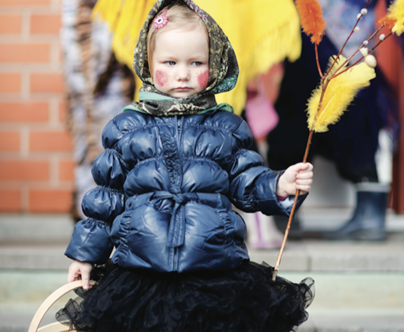 At Easter, it’s tradition for Easter witches to go out in their witch costumes with old coffee pots and baskets in hand, welcoming spring to their neighbors by waving willow twigs blooming with small, furry kissat (“kittens”) in Finnish.
