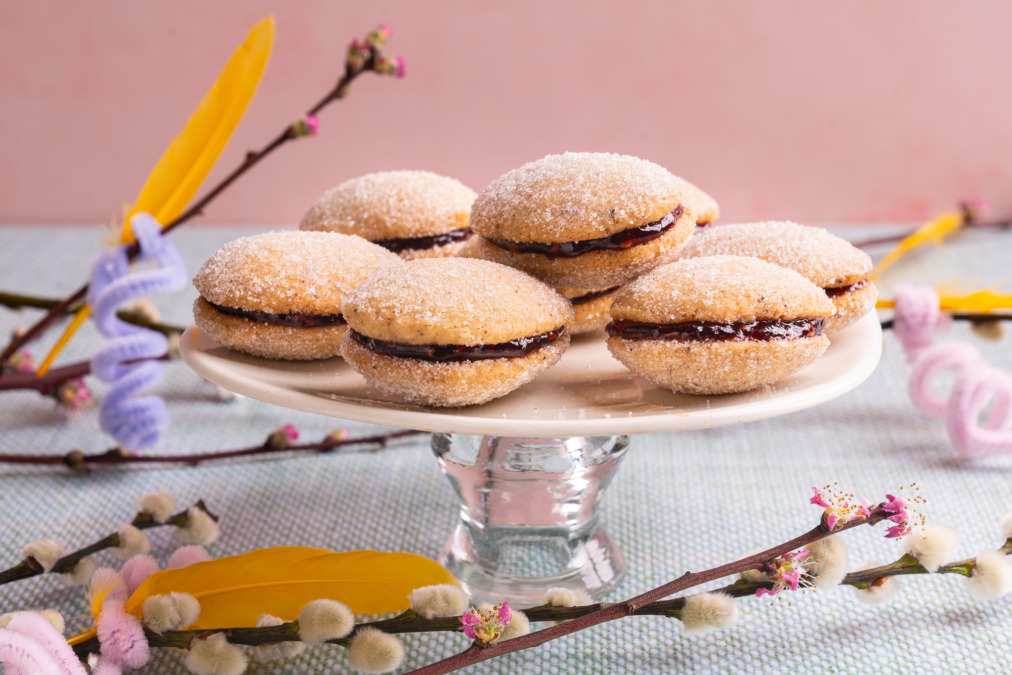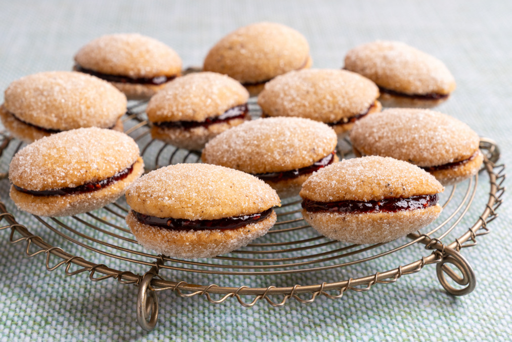 Once the spoon-shaped cookies come out of the oven, allow them to cool slightly so you won’t burn your fingers on the next step. Each cookie is tossed in a bowl of granulated sugar to coat the outside, imparting a glittery shimmer and crunchy character that further adds to the uniqueness of these cookies. They should be cool enough to handle, but still slightly warm, so the sugar adheres. When completely cool, spread a thin layer of jam on the flat side of one cookie and place another on top to form a sandwich. Apricot or raspberry are great options, but you can feel free to use your favorite flavor.