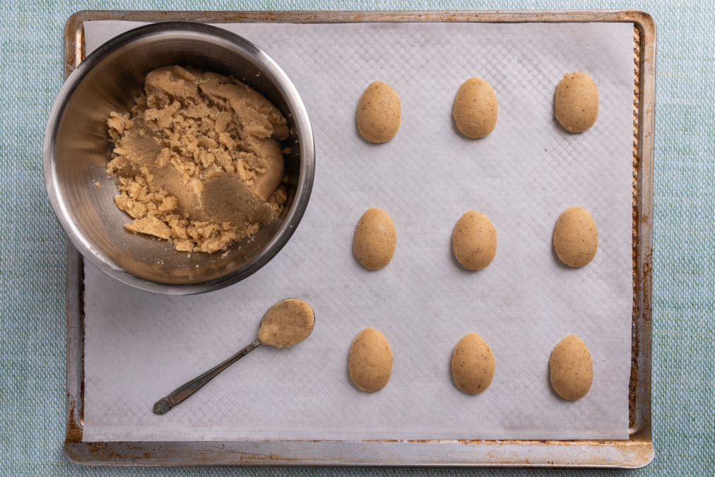 Shape the cookies by pressing the dough into the well of a spoon, leveling the top. Gently invert the cookie, flat side down, onto parchment-lined baking sheets.