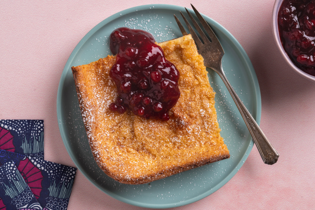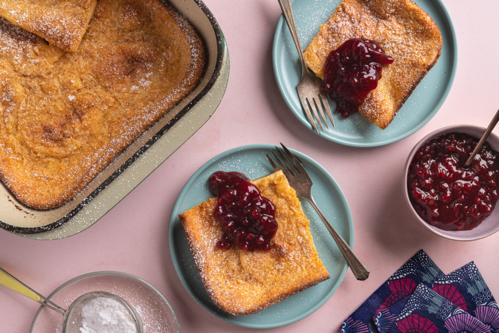 To serve, cut the pancake into squares, dust with powdered sugar, and serve with lingonberry jam.