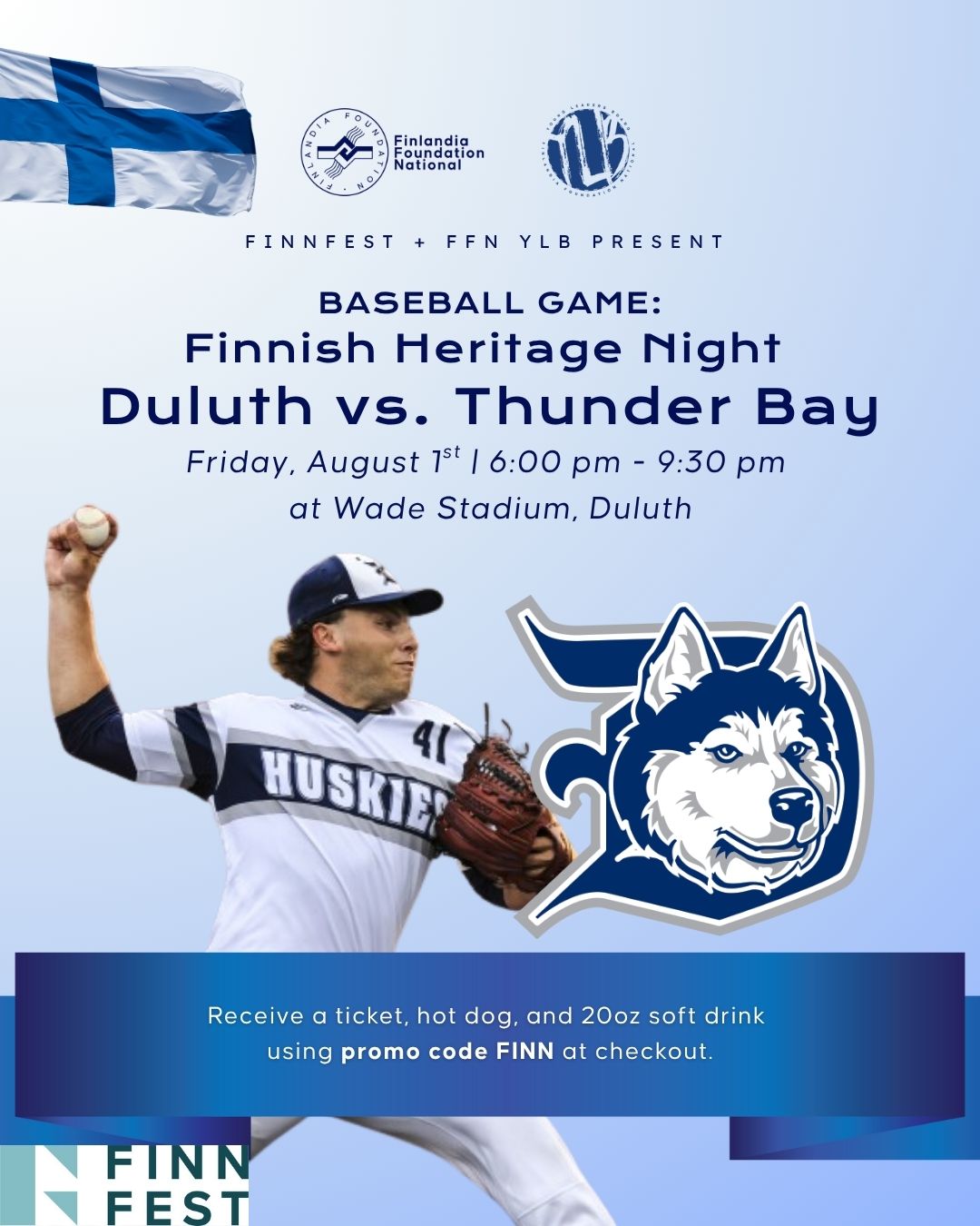 Join us on Friday, August 1st as the Duluth Huskies take on the Thunder Bay Border Cats on Finnish Heritage Night at the Ballpark. Use promo code FINN at checkout for a $20 package that includes one ticket, one hot dog, and one 20oz non-alcoholic beverage. We look forward to see our Finn-tastic community at the game!