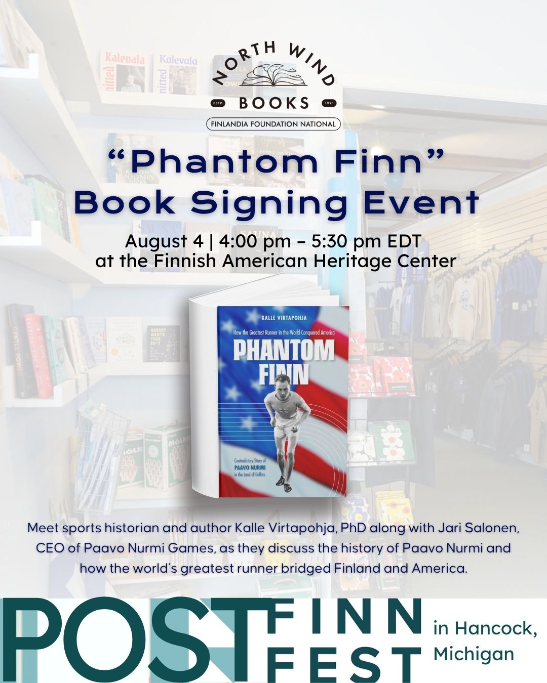 Don’t miss Phantom Finn! You can get your signed English language copy of Phantom Finn. This is an engaging story about how one of Finland more iconic athletes and most famous runners connected people from Finland to the United States. Dr. Kalle Virtapohja tells the story, now available in English. Stay tuned for a book signing announcement at the North Wind Books Tori booth!