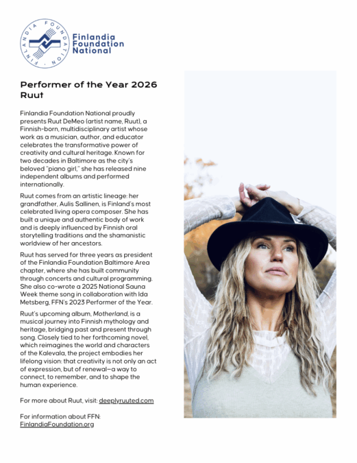 Contact the FFN office to determine availability for Ruut’s appearance; click here or email office@finlandiafoundation.org: